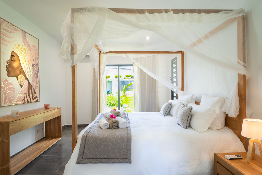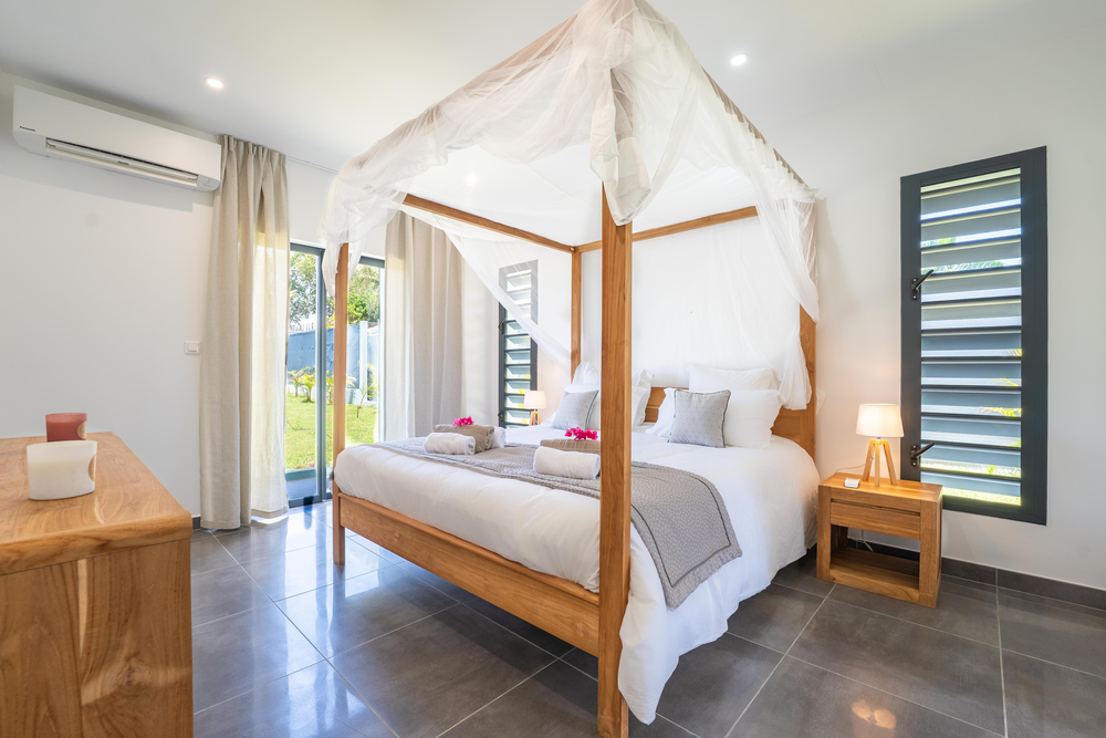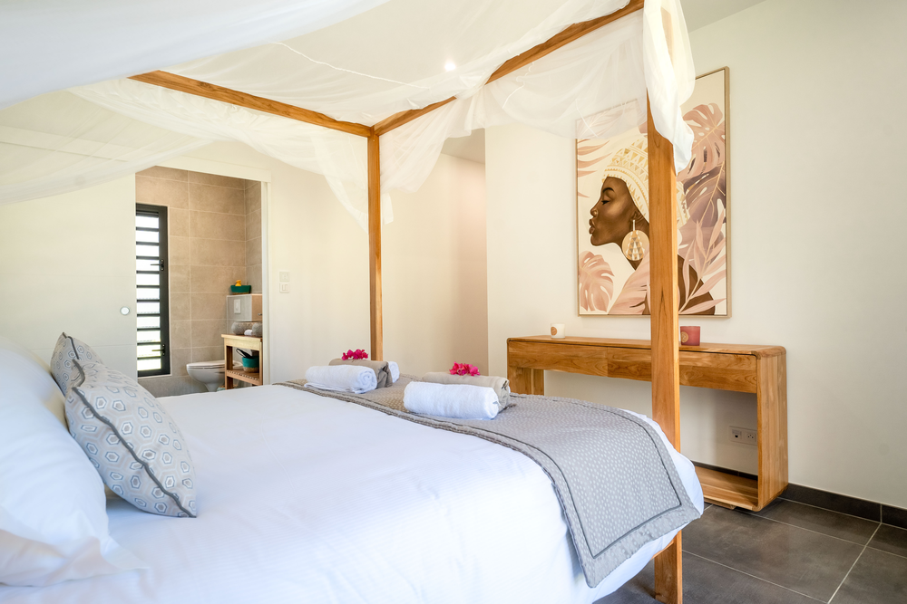 Une master bedroom climatisée meublée d’un lit baldaquin de 180X200 avec salle d’eau et wc attenants