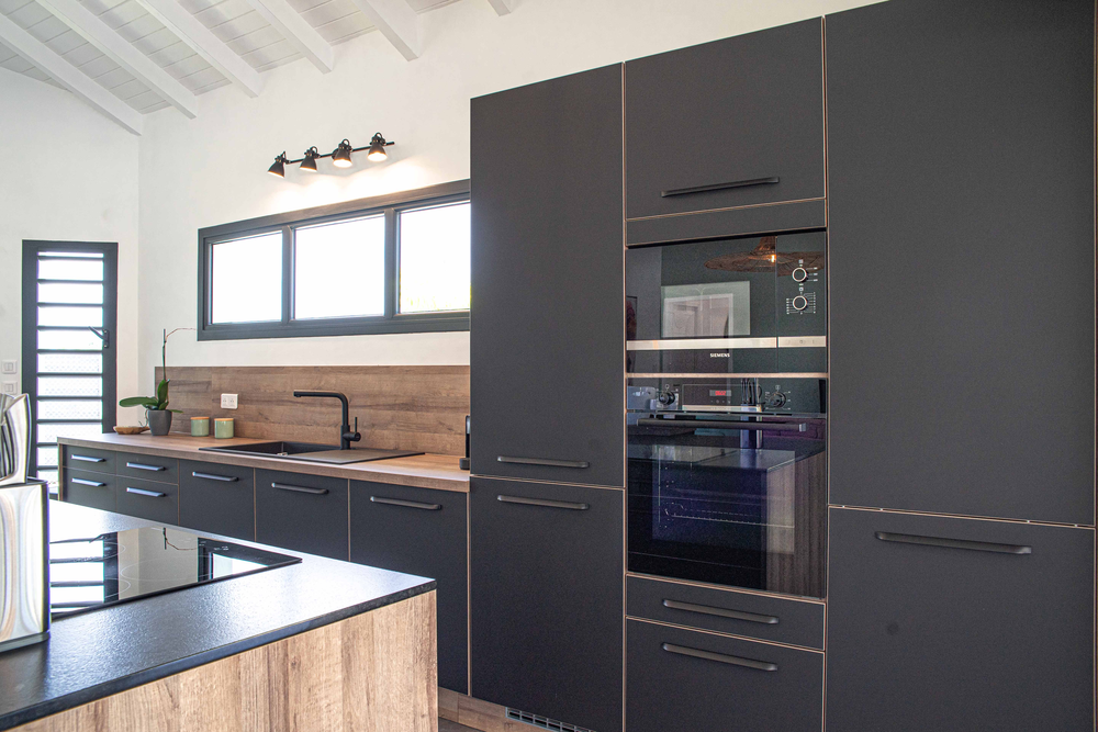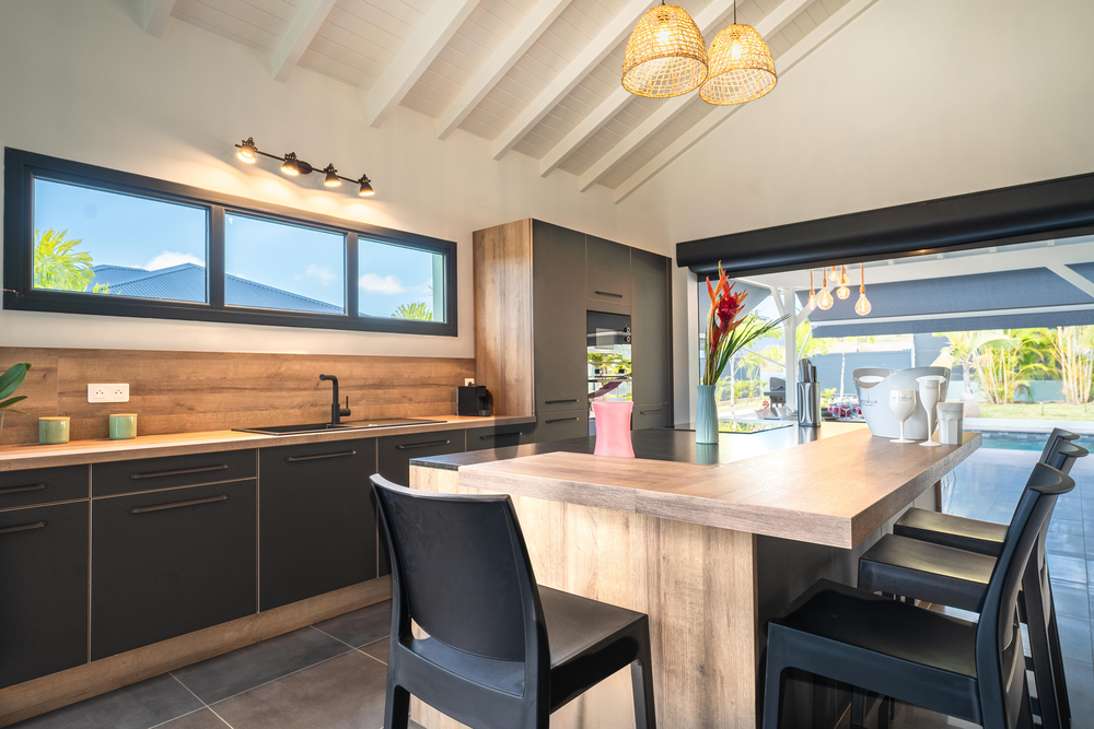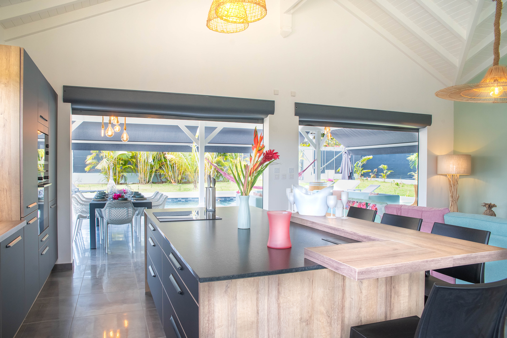 Les espaces à vivre intérieurs disposent d’une cuisine moderne et parfaitement équipée, largement ouverte sur l’extérieur.