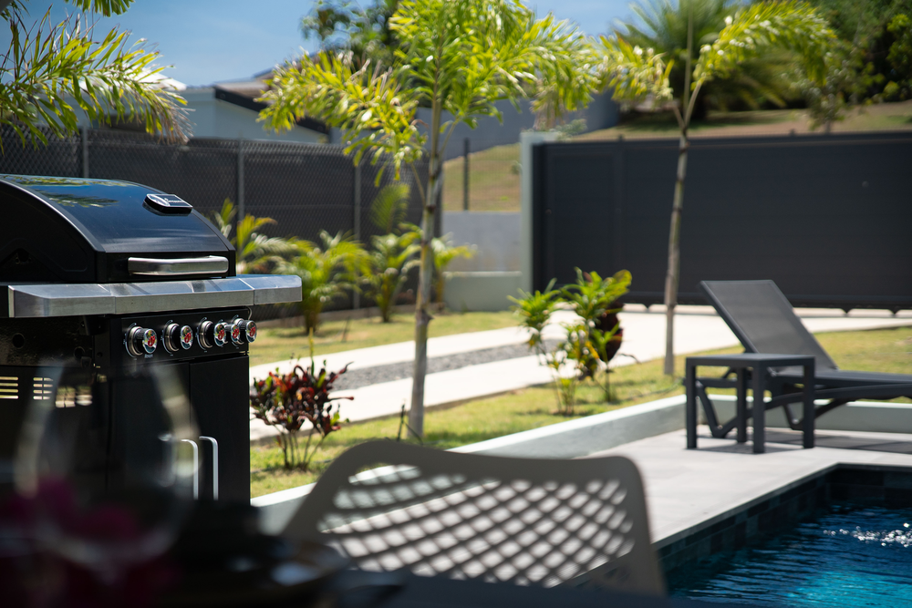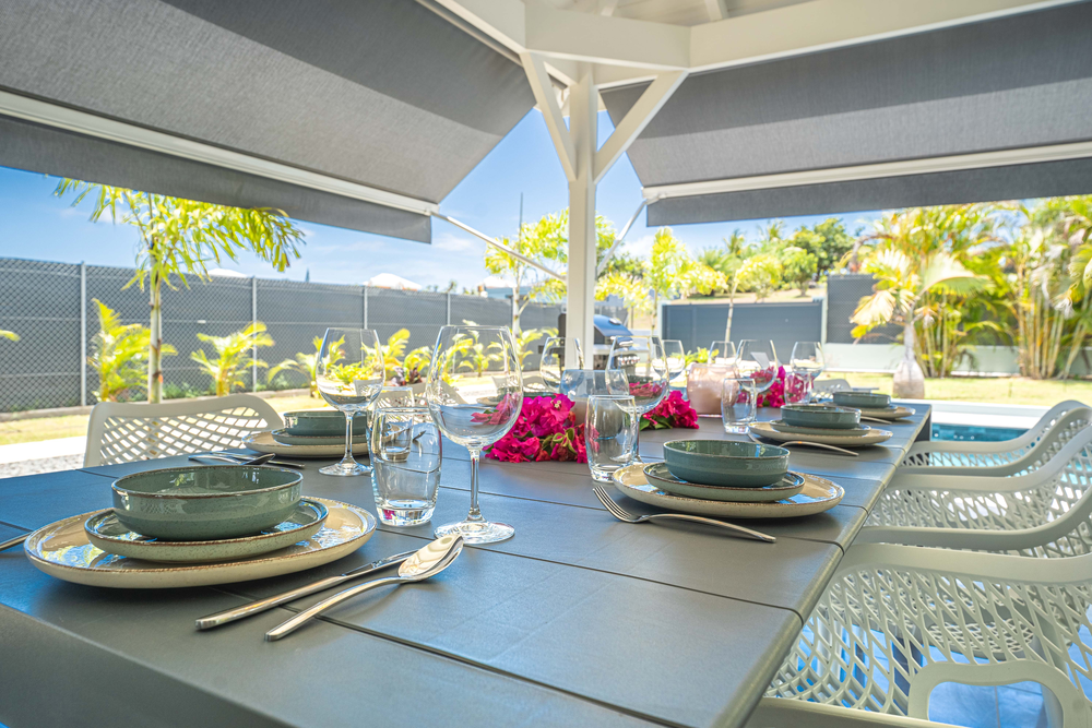 La grande terrasse confortable faisant face à la piscine au sel bénéficie du soleil toute la journée, l’extérieur devient une pièce à vivre à part entière.