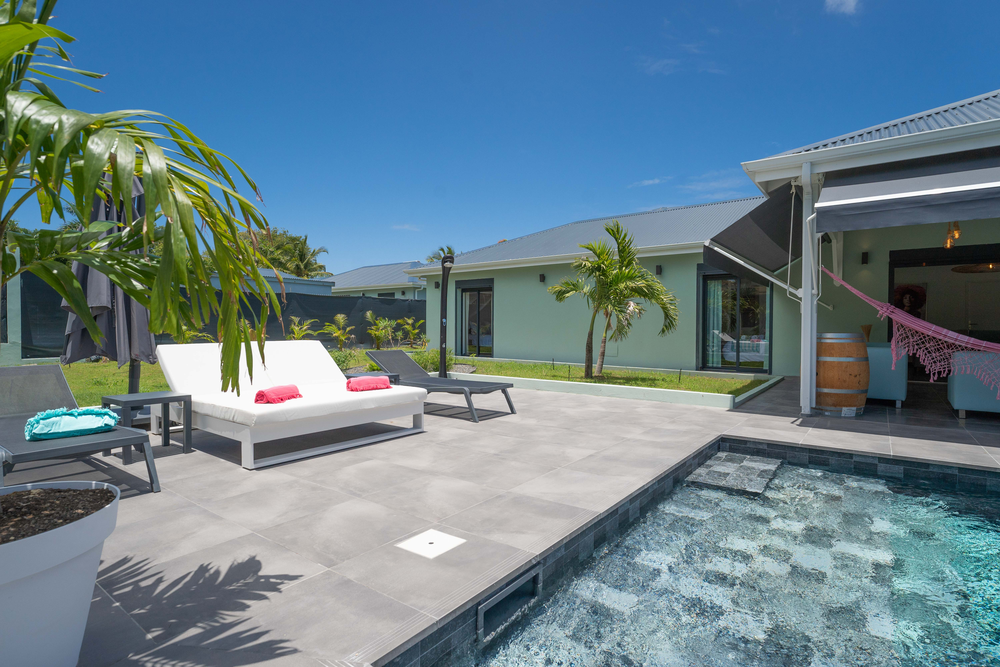 Magnifique Bungalow neuf, idéalement située dans un quartier calme de Saint-François. Proche golf, plages, commerces, marina et restaurants. Petite piscine privative 2,5X2,5. Hébergement en Guadeloupe
